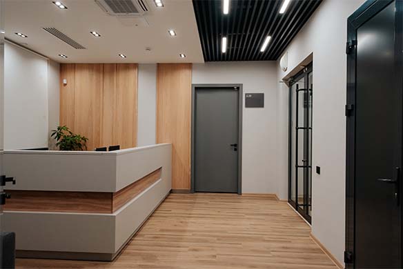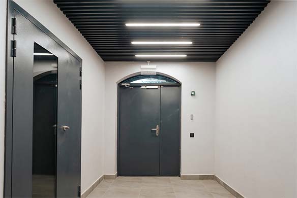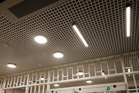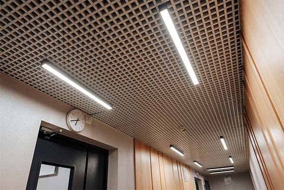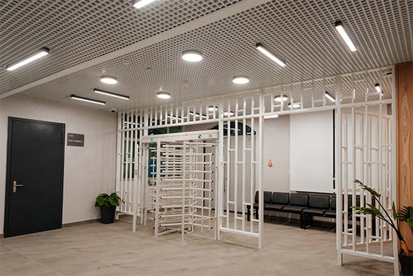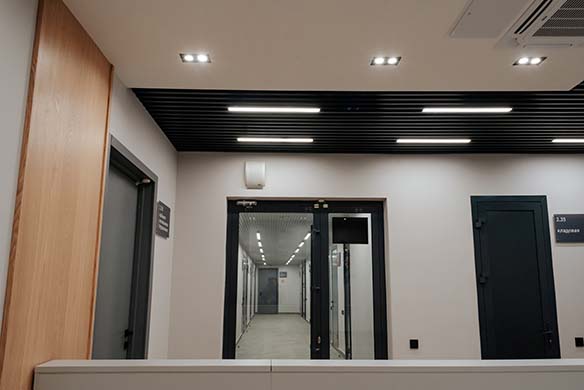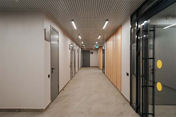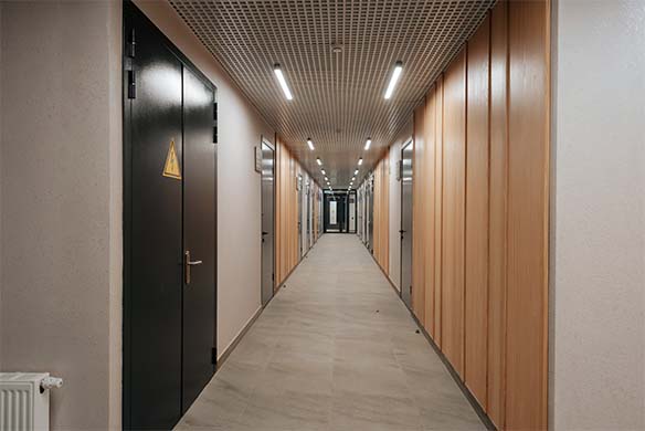 В коридорных помещениях установили светильники серии D-LINE SIMPLE накладного типа крепления. Длина светильников от 500 до 1000 мм, мощность от 13 до 31 Вт, IP 54.