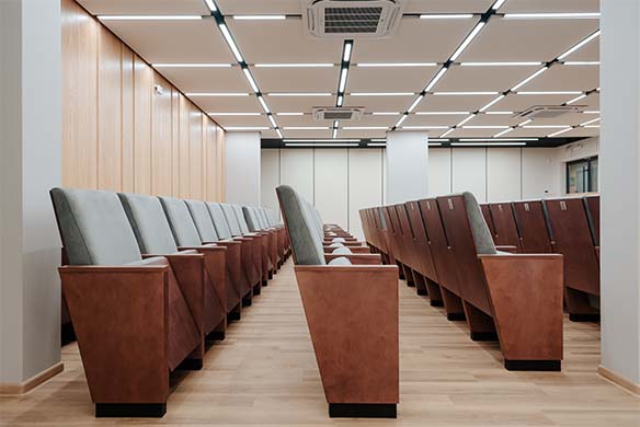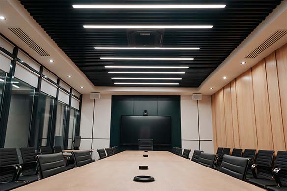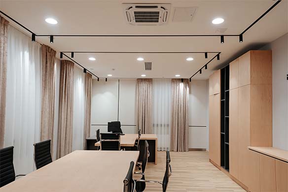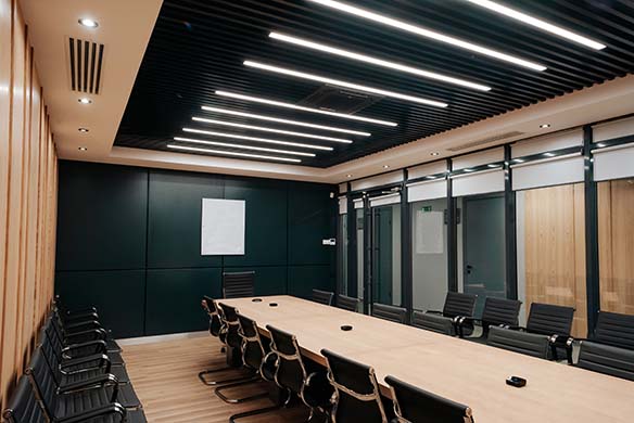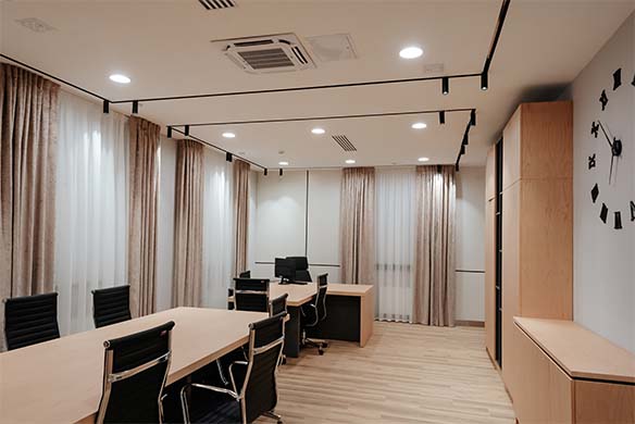 В конференц-зале - те же светильники D-LINE SIMPLE подвесного типа крепления. В приёмной комнате и кабинете установлена трековая система направленного освещения.