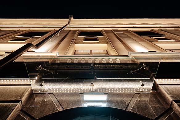 Для подчёркивания контуров здания мы использовали архитектурные светильники D-ARCHILINE TUBE длиной от 1000 до 3000 мм. Всего на здании светильников этой серии 73 500 мм.