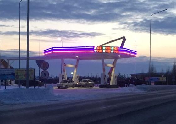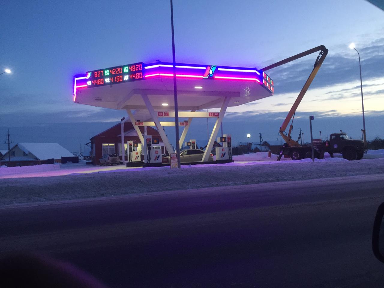 С помощью светильников D-ArchiLine Tube A Colour был подсвечен фасад конструкции автозаправочной станции "ТатНефтеПродукт" в городе Арск (Республика Татарстан).