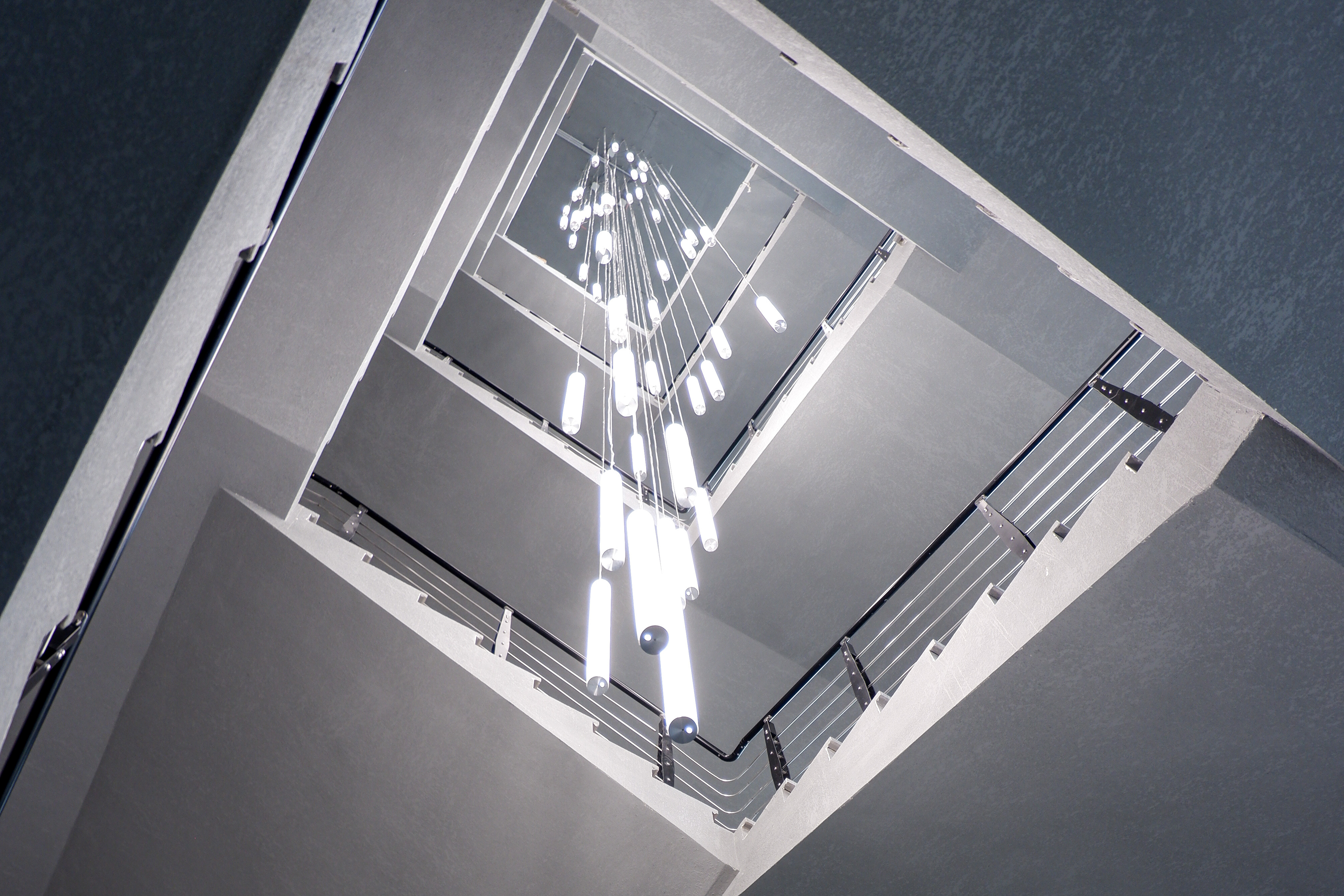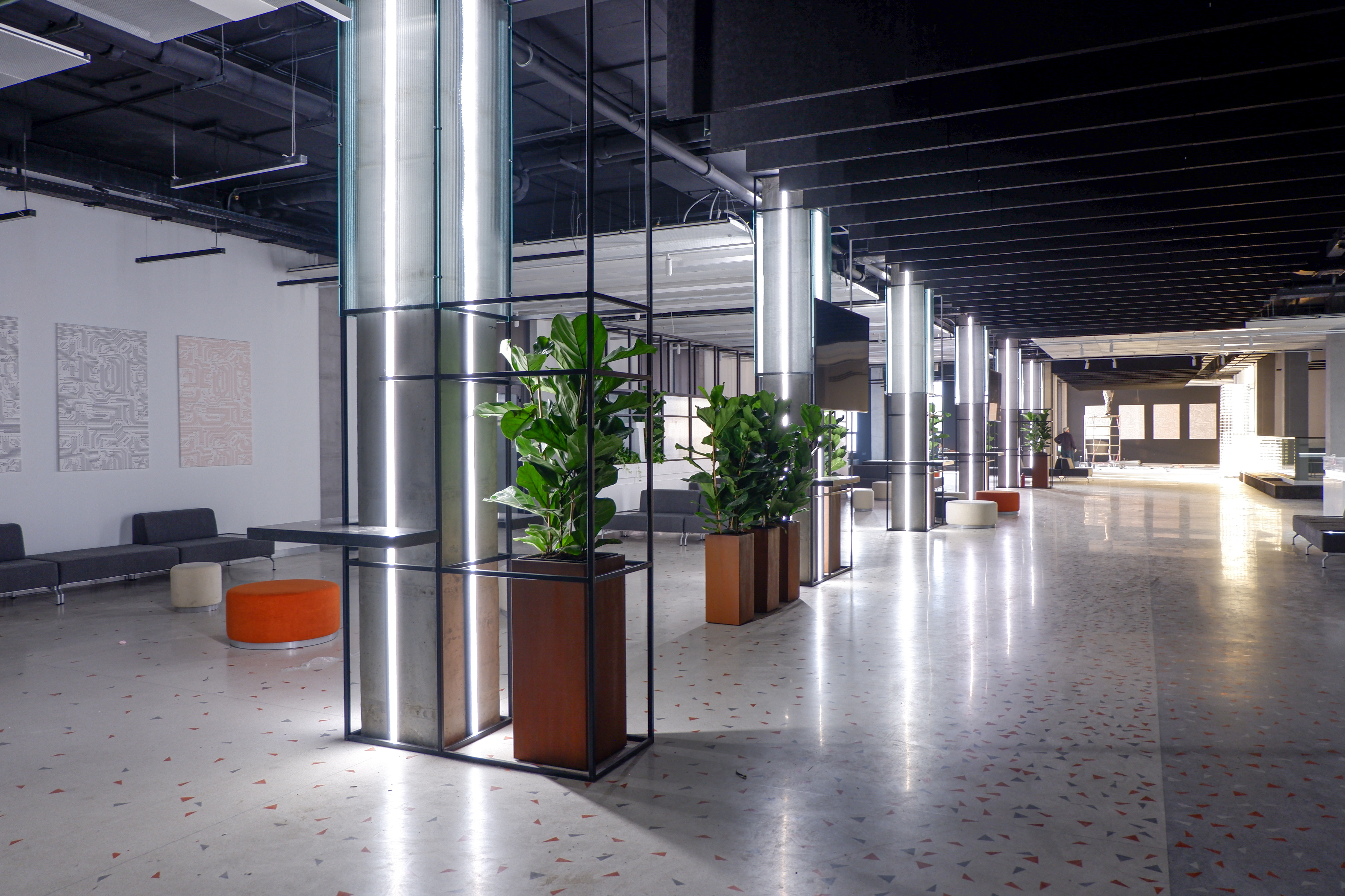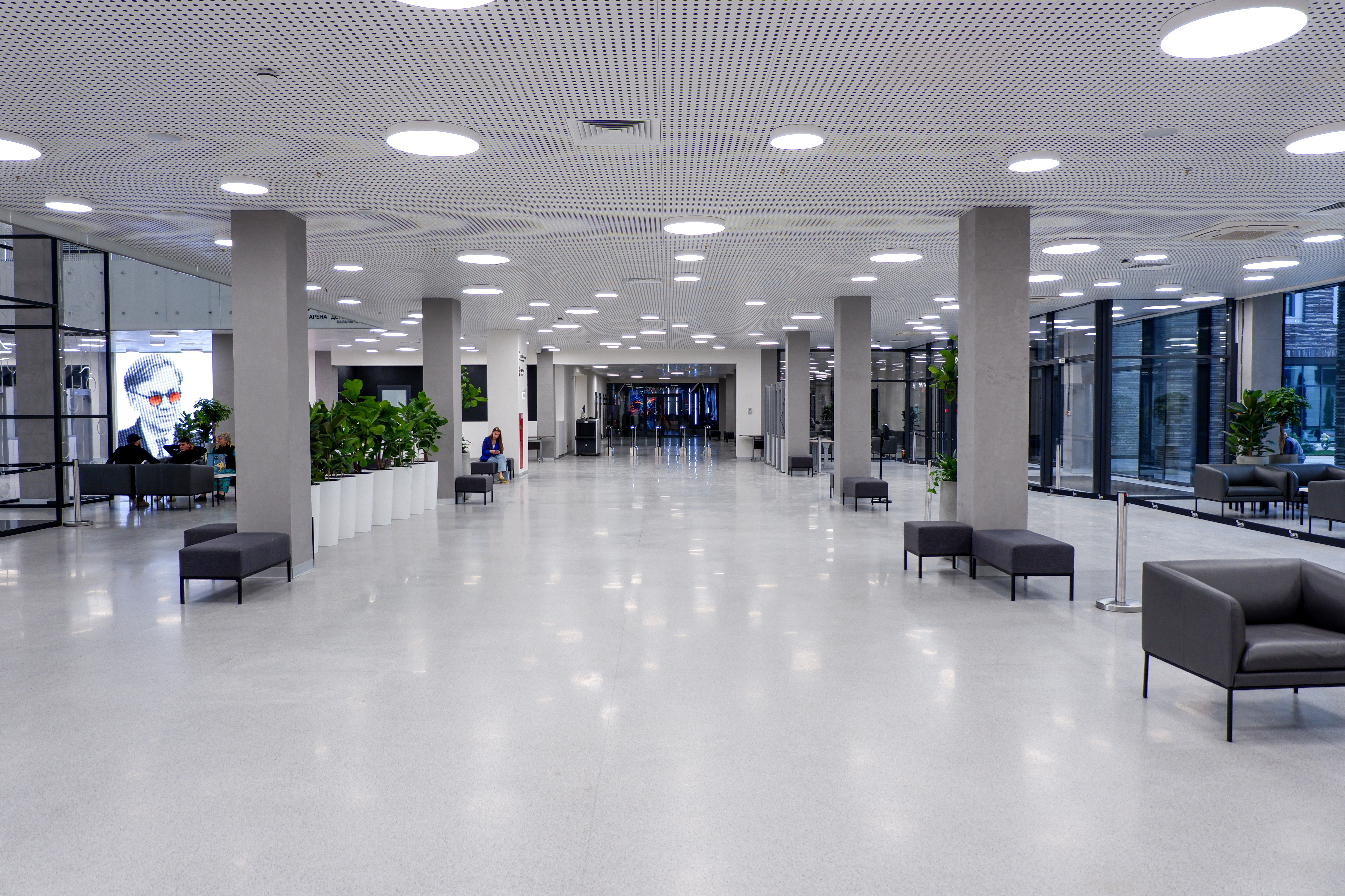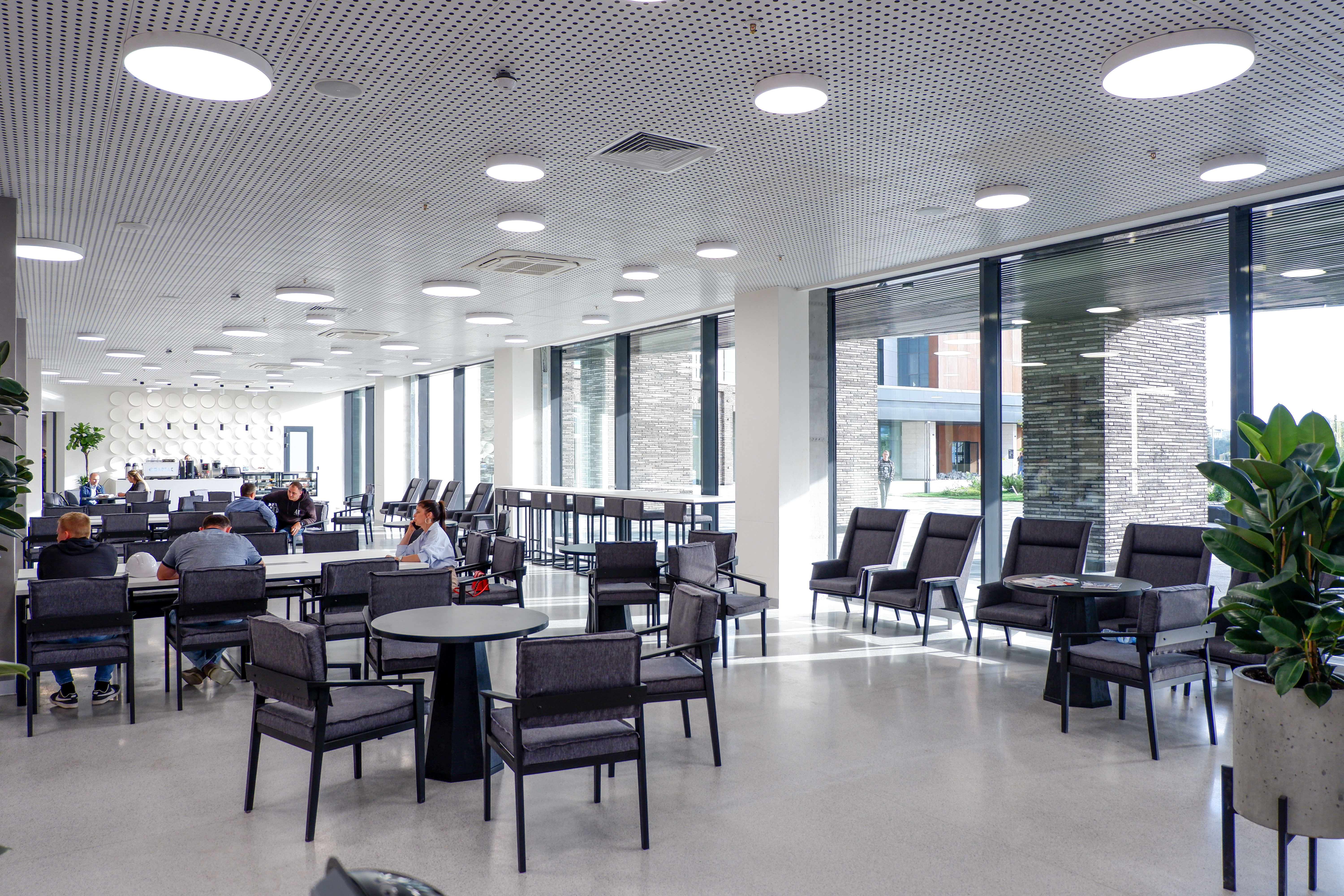 Основными светильниками, освещающими большие зоны внутри здания, такие как фойе первого и второго этажа, библиотека и стартаб-хаб, стали светильники D-Line мощностью 26 Вт, D-Ring A мощностью 30 и 60 Вт, D-Ring В мощностью 98 Вт и D-Ring Trio мощностью 60 Вт. Для создания равномерного освещения в кабинетах и административных помещениях использованы светильники D-Trek разных мощностей. Встроенные в потолок светильники D-Line расположены перед входом в здание, имеют разную мощность (14,28 и 42 Вт) и разный размер (1,2,3 метра), а 30-ваттные освещают лестницы и проходы. В здании имеется лестница, ведущая к VIP-помещениям, там использованы светильники D-Line Corner с мощностью 30 Вт.