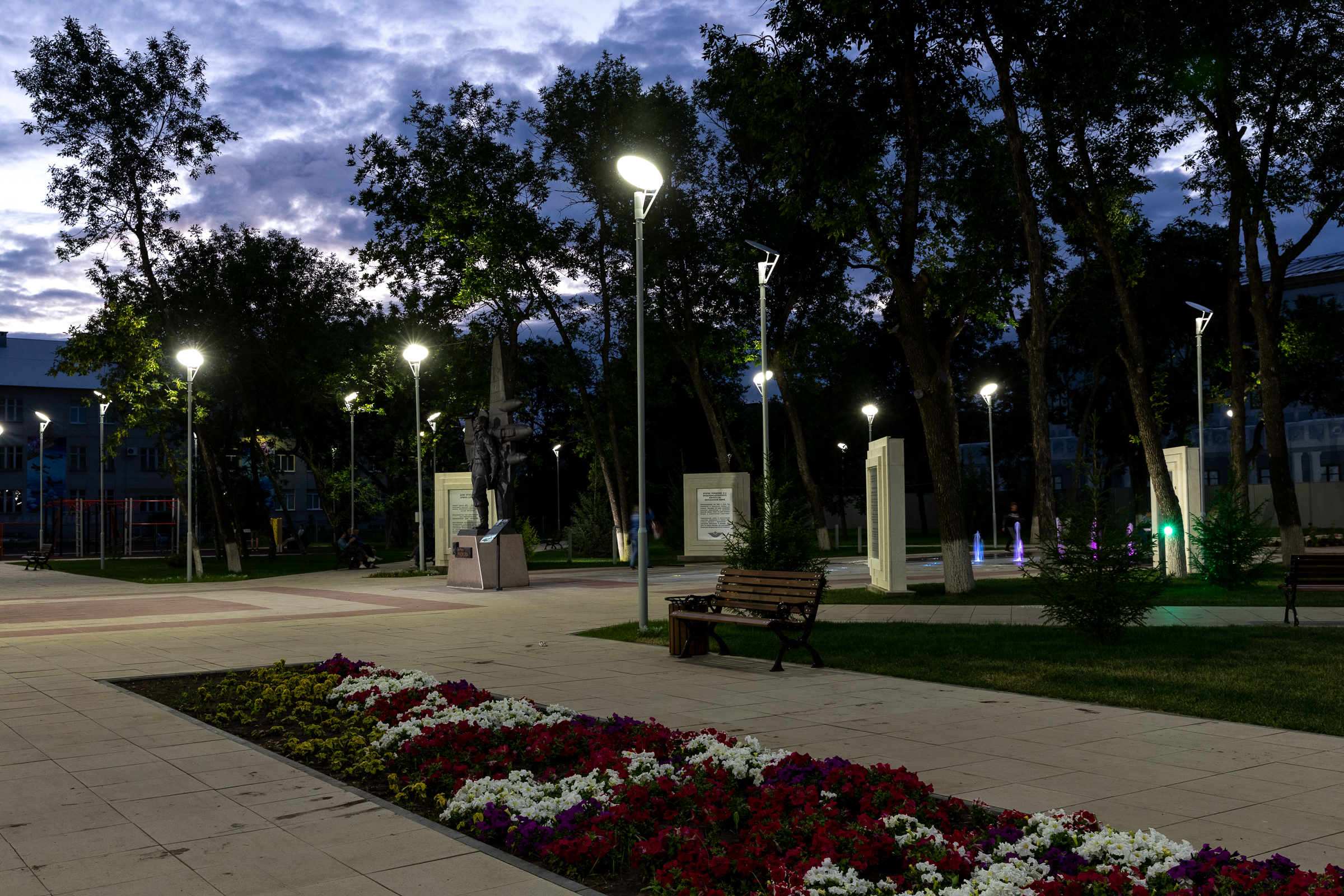 Последним рывком в борьбе с неосвещенными участками парка была центральная стела которую эффектно подсветили светильники серии D-ArchiLine Kamerton, напомним, что комплекс состоит из опоры, закладной детали фундамента и светильников. На одной опоре можно установить от одного до трех светильников, в зависимости от стоящей задачи по освещенности объекта. Благодаря специальному креплению каждый светодиодный модуль можно поворачивать по вертикали на 360 градусов и по горизонтали в пределах 36 градусов. Задать требуемый угол освещения позволит применение вторичной оптики Ledil. Стильный корпус защищен от коррозии методом горячего цинкования, а также имеет высокую степень пылевлагозащиты IP67.