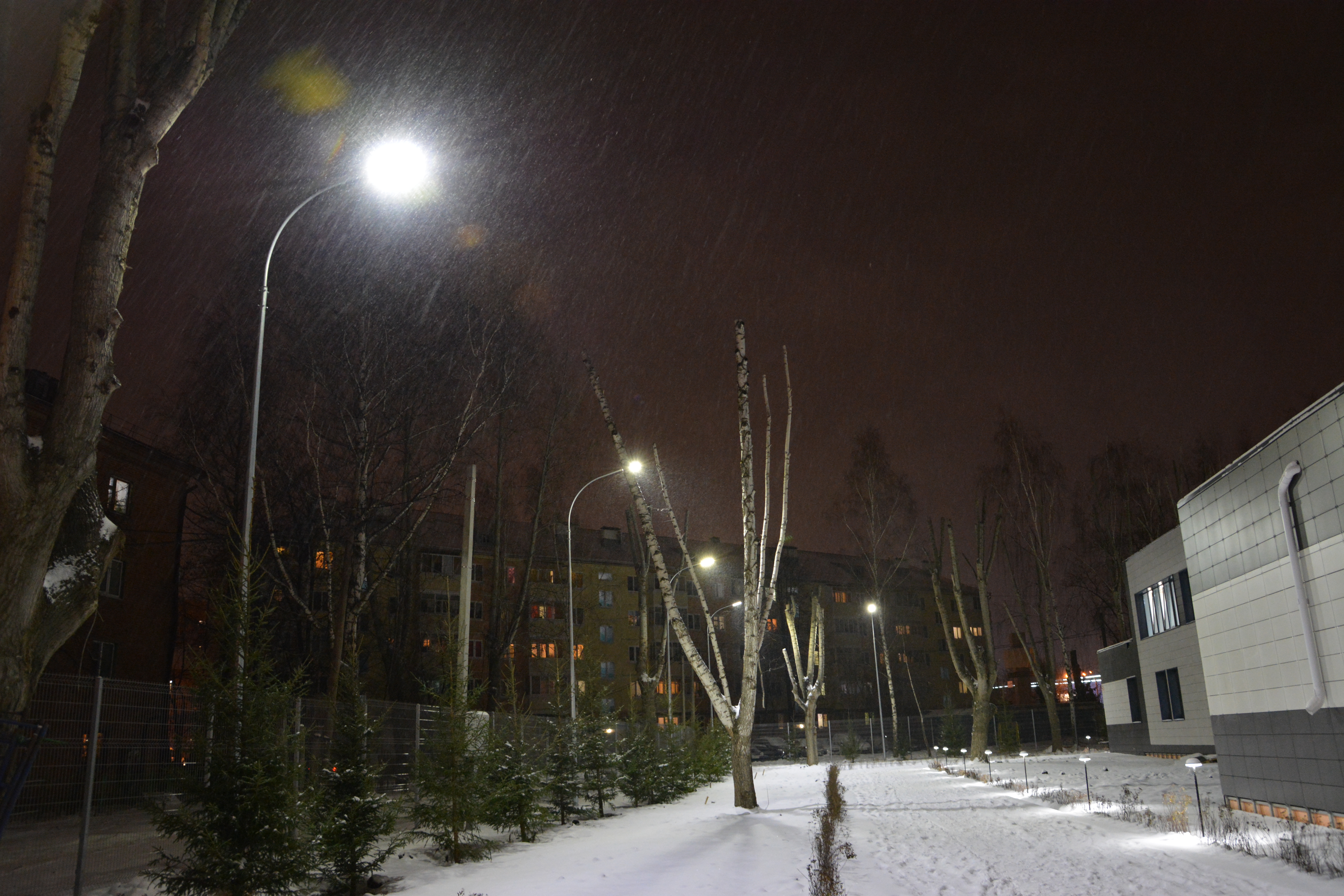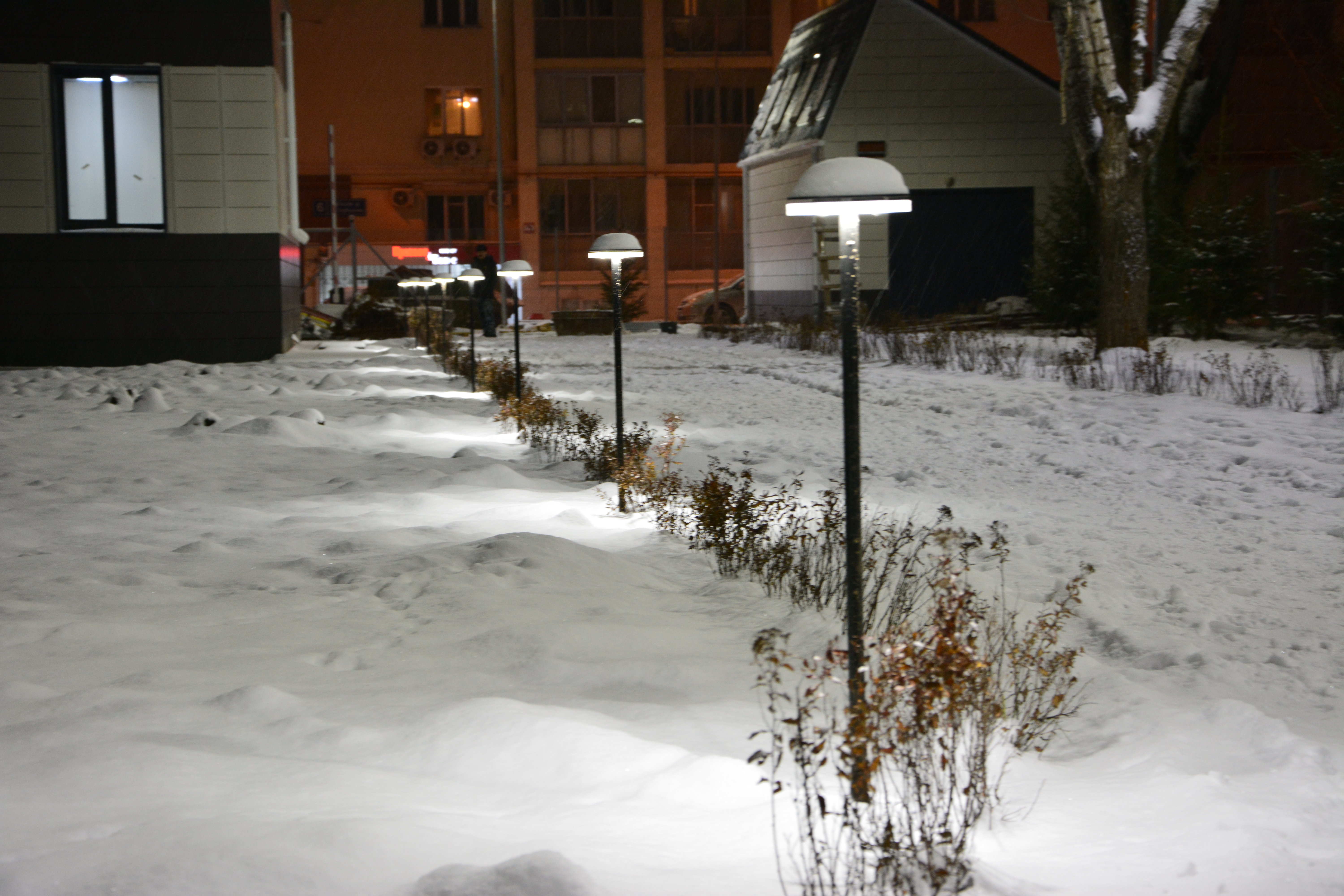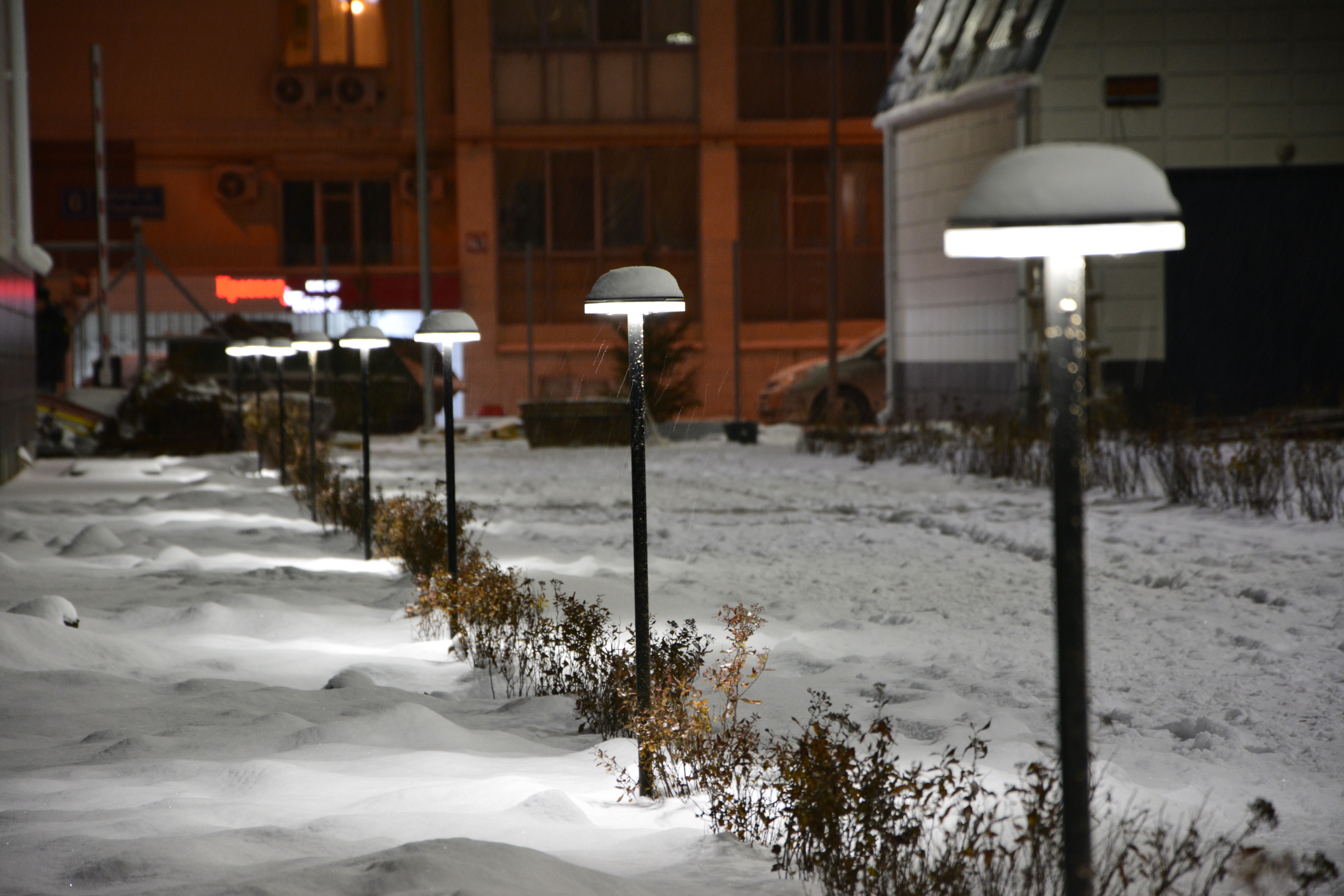 Внутренние пешеходные дорожки также подсвечены светильниками DIODIS. По одному краю дорожек установлены светильники парковой серии D-ArchiLine 12. По своей форме они напоминают "грибочки". Эти светильники - одна из новинок нашего производства, которая пользуется высоким спросом. Совсем скоро вы сможете увидеть полную информацию о светильнике на нашем сайте, следите за новостями!