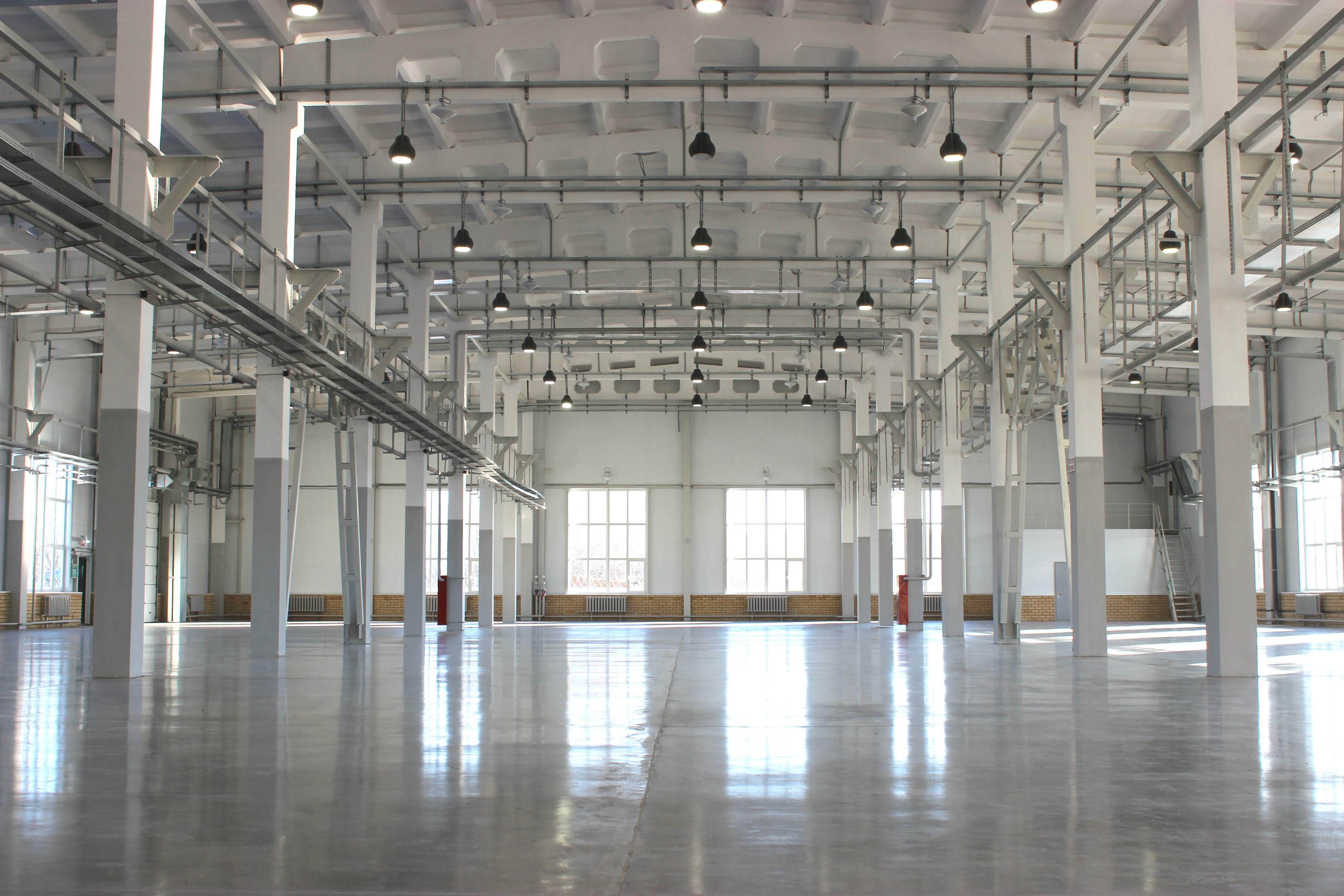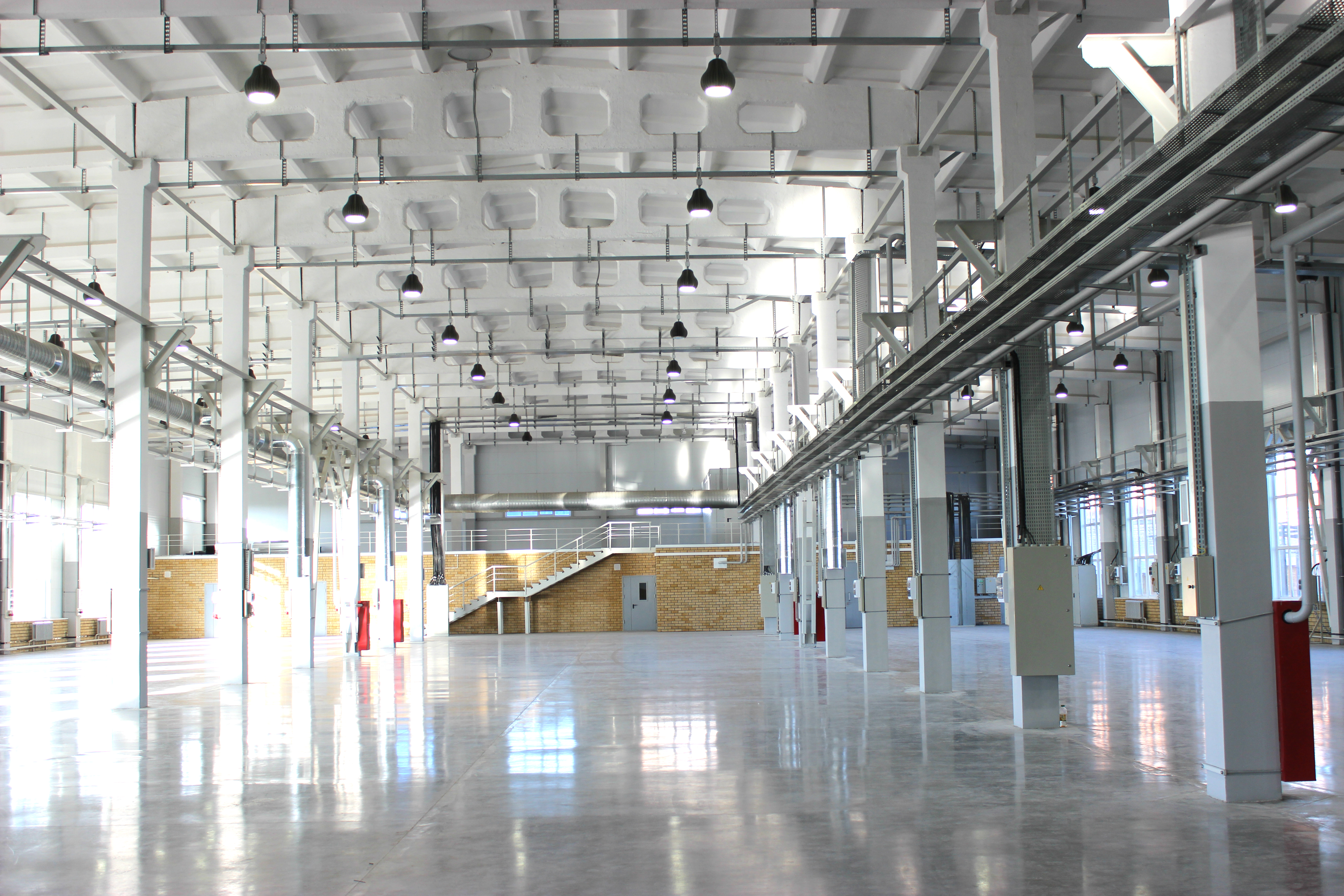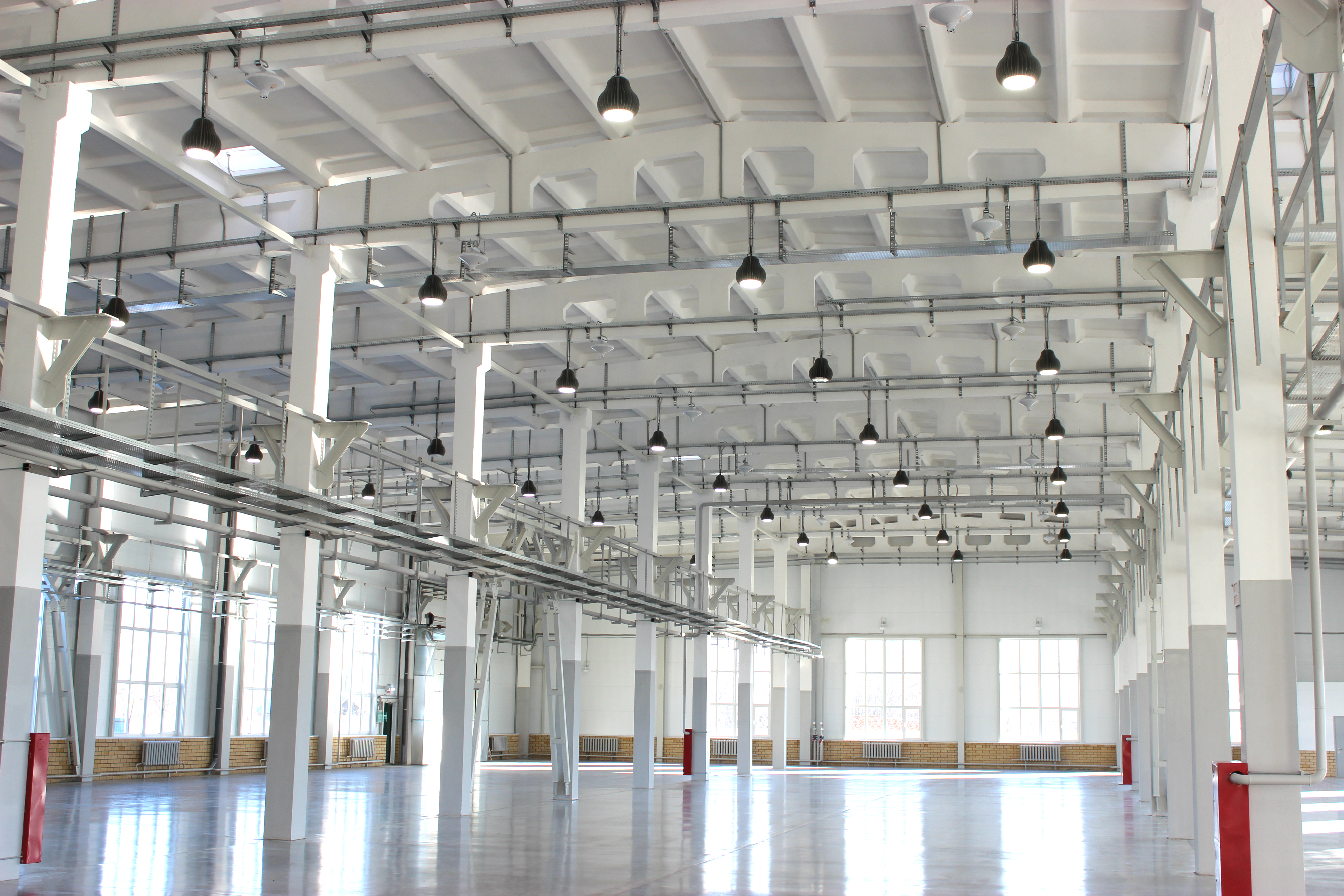 Промышленные дизайнерские светильники удачно "вписались" в общий вид производственного корпуса. Установленные под потолком просторного здания, они привлекают внимание и, не смотря на площадь цеха, обеспечивают высокий уровень освещенности.